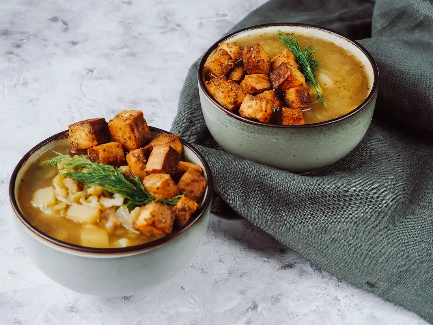 Przepis na grochówę w wersji roślinnej to propozycja nie tylko dla wegetarian czy wegan! To lepsza i zdrowsza wersja tradycyjnej polskiej grochówki. Dzięki wędzonemu tofu nie odczuwamy braku mięsa, a zupa jest aromatyczna i bardzo sycąca.