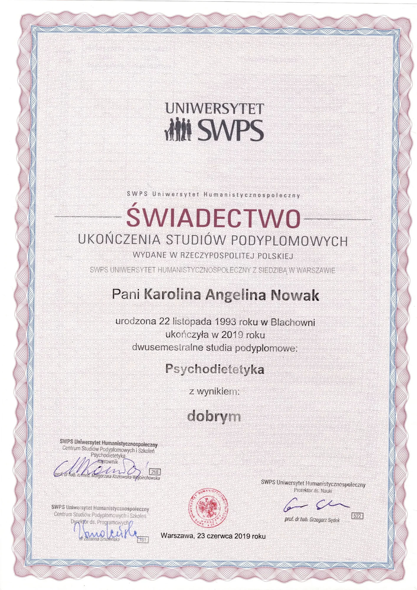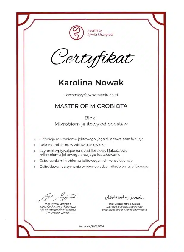 Swoją przygodę z dietetyką rozpoczęłam na Uniwersytecie Medycznym w Łodzi oraz SGGW w Warszawie. Jako studentka dietetyki nie mogę pochwalić się “fit” życiem, które wtedy wiodłam. Pomimo posiadania wiedzy na temat odżywiania nie umiałam ich wprowadzić w życie na stałe. Mogłam podzielić wtedy moje życie na okresy diety i treningów i zupełne niezwracanie uwagi na to, co jem i czy w ogóle mam jakąś aktywność fizyczną. Słowo “dieta” nie jest mi obce. Ze swojego doświadczenia wiem, że diety nie działają, dopóki nie zrozumiemy i nie zmienimy swojego dotychczasowego myślenia. Dlatego uważam, że nie ma dietetyki bez psychodietetyki.